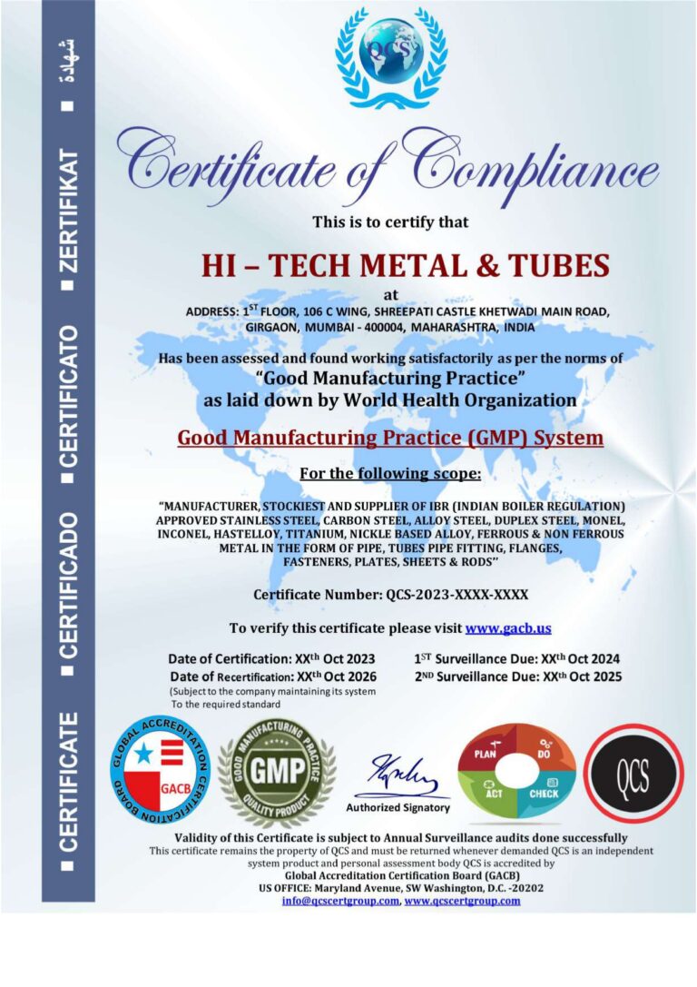 Our manufacturing partner Hi Tech Metal & Tubes holds the following internationally recognized certifications: