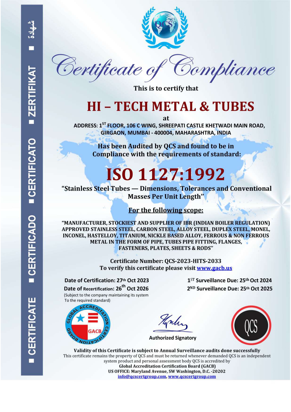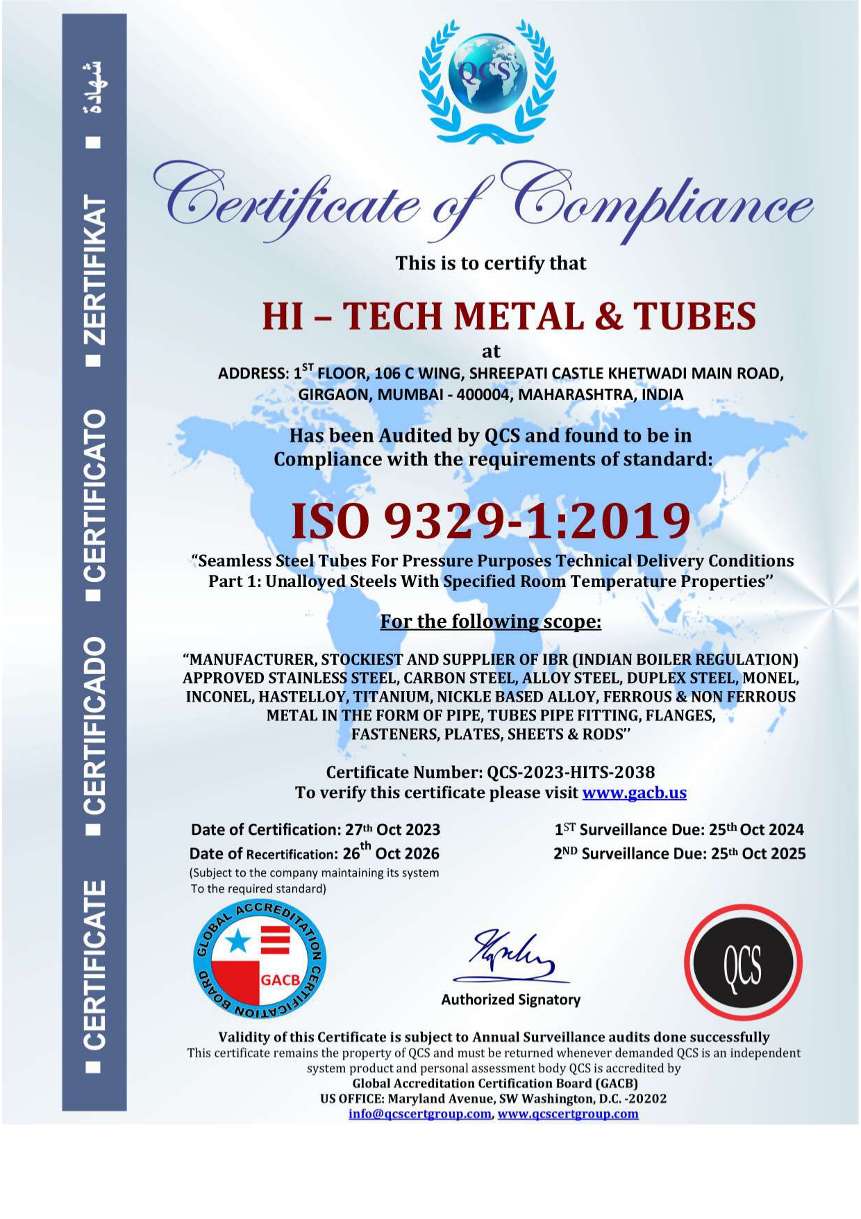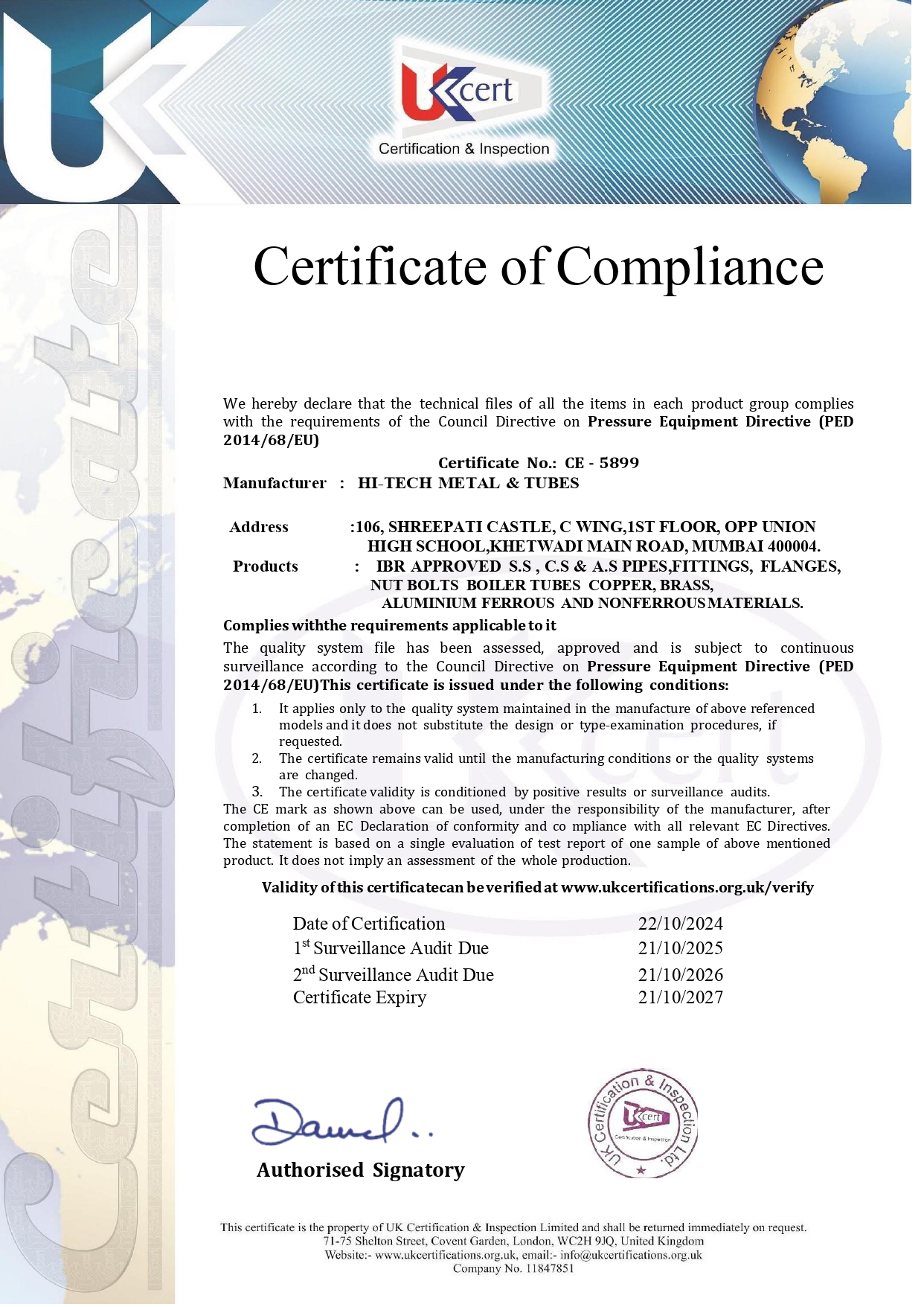 Our manufacturing partner Hi Tech Metal & Tubes holds the following internationally recognized certifications: