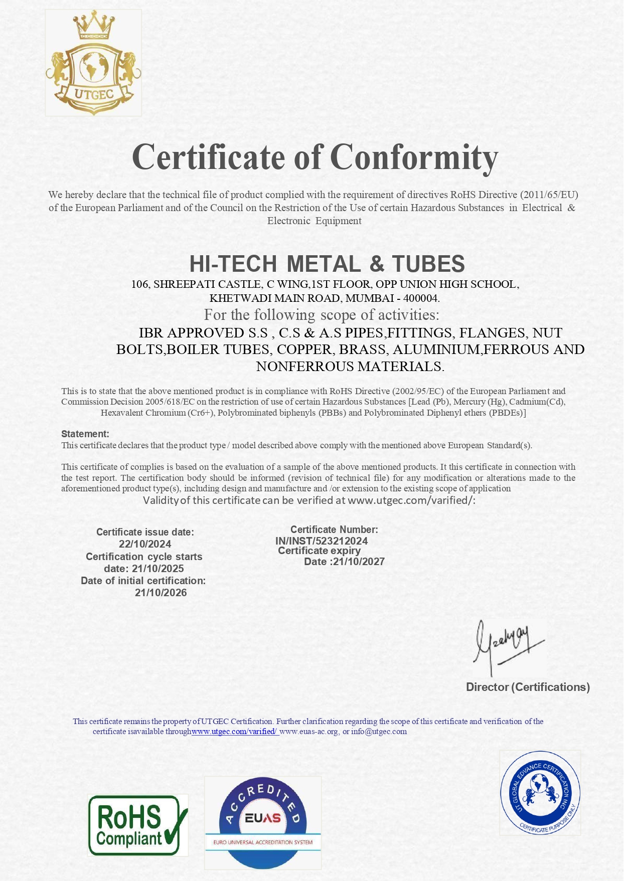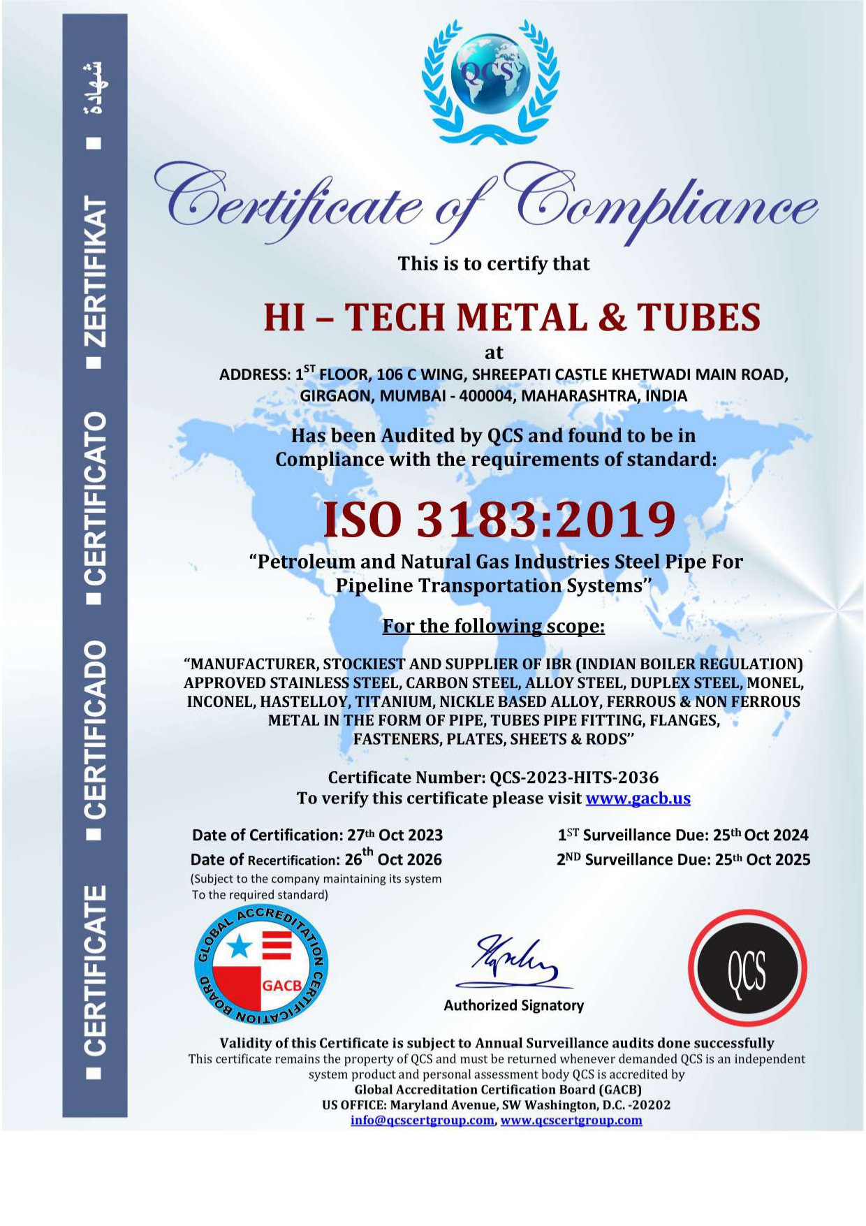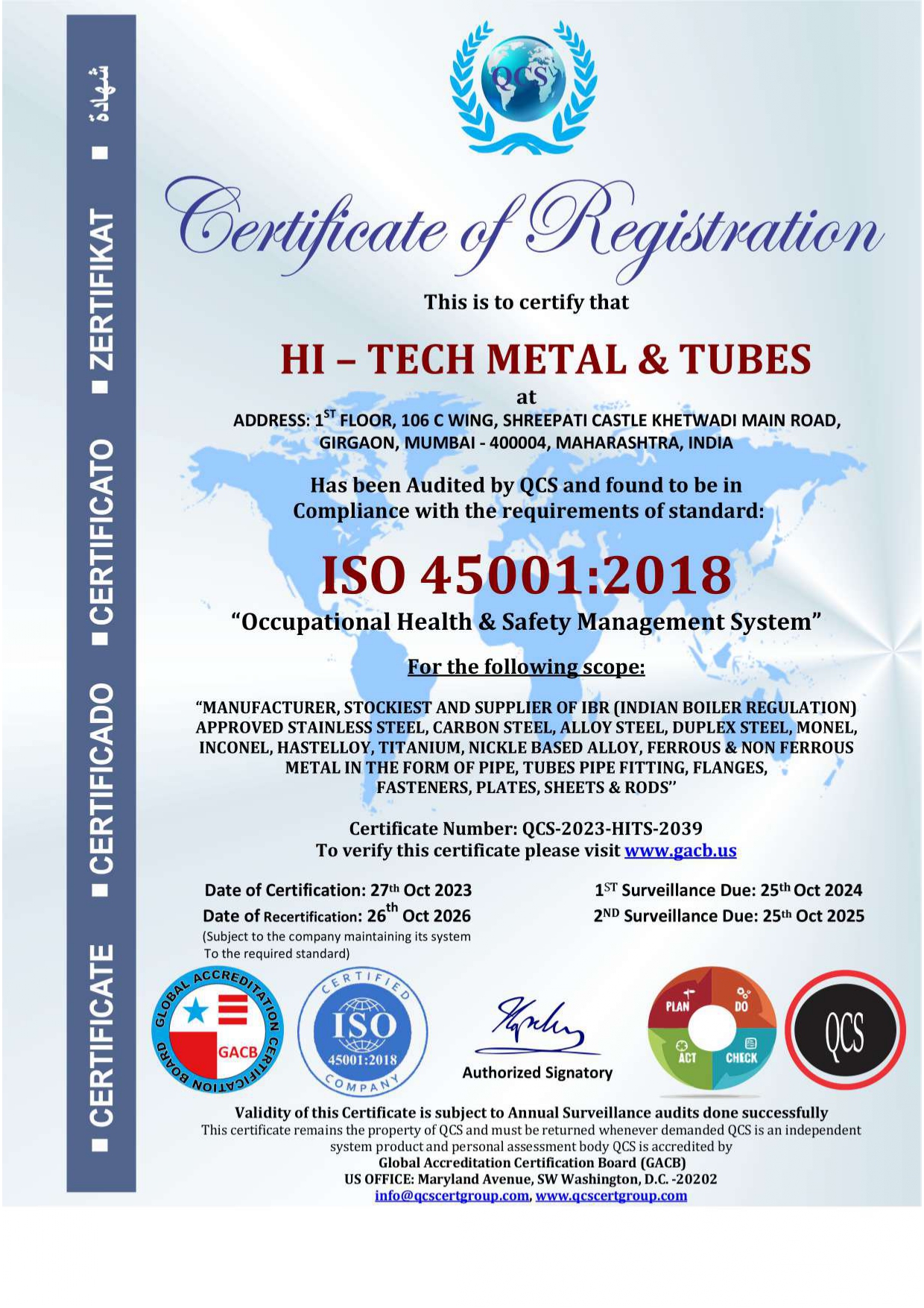 Our manufacturing partner Hi Tech Metal & Tubes holds the following internationally recognized certifications: